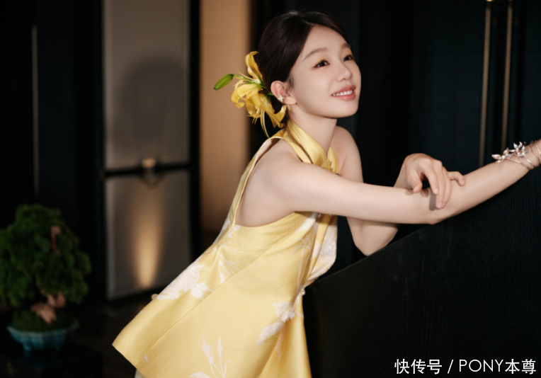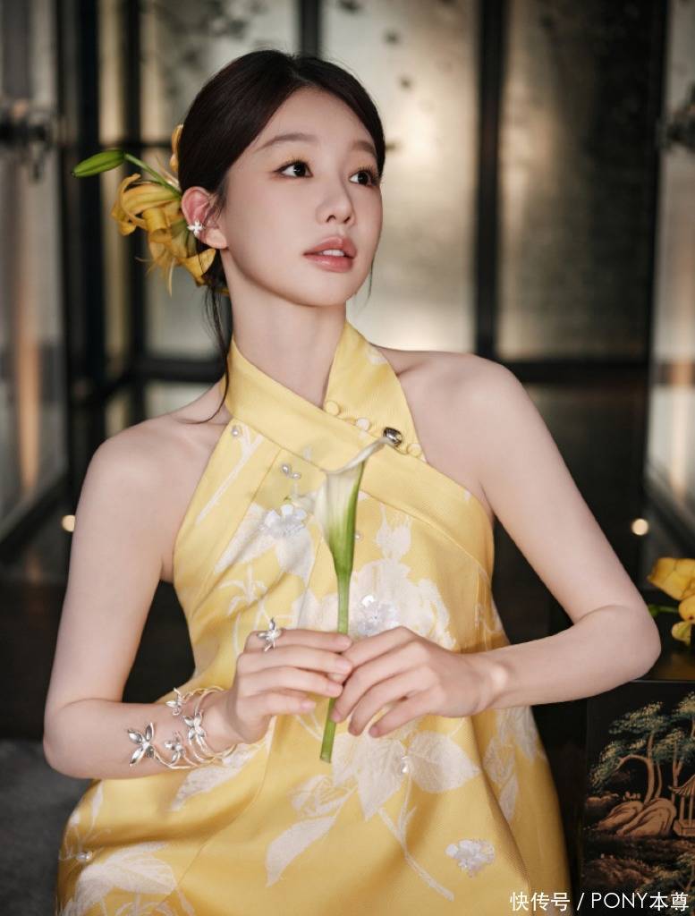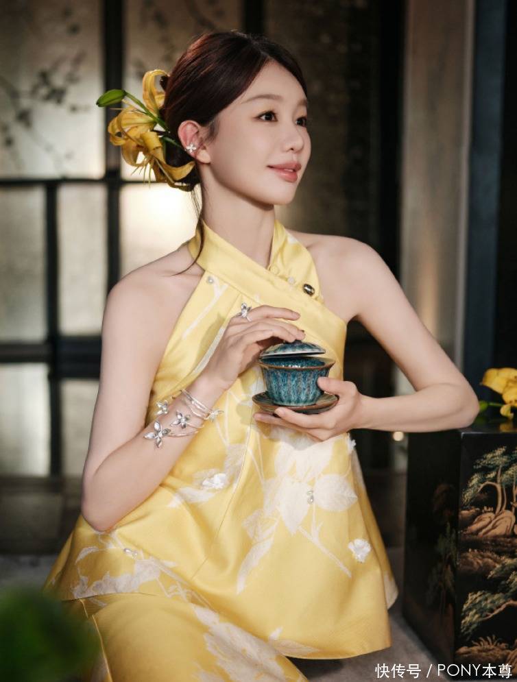 徐梦洁选择的这款新中式服饰,是无袖的款式,露出优越的肩颈线,黄色缎面设计上点缀着白色花朵装饰,光泽感让服饰充满质感!